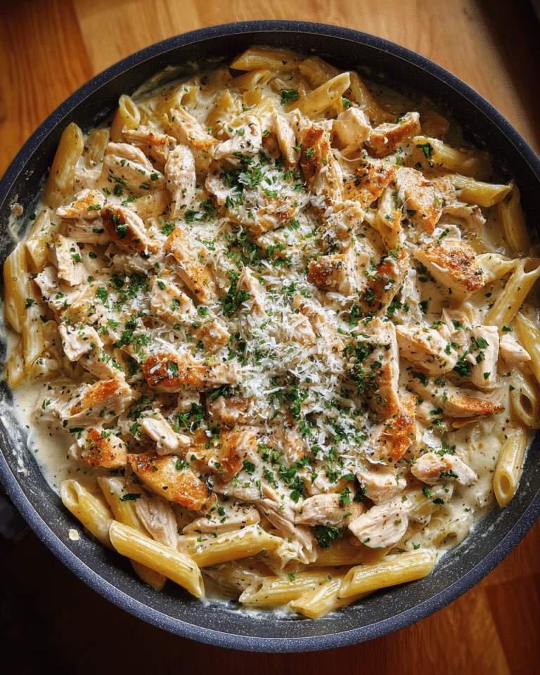 Toss cooked pasta into the sauce. Add reserved pasta water as needed for creaminess. Return chicken to skillet and stir until fully coated.
