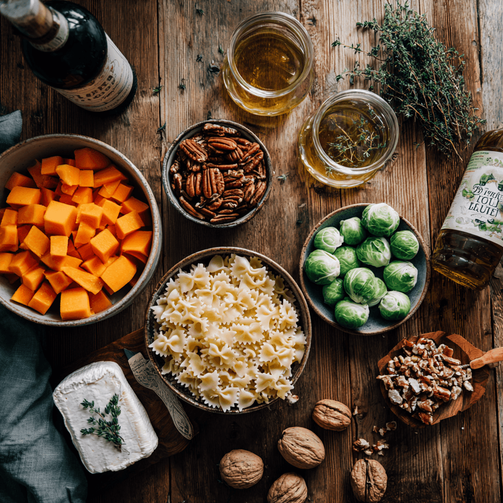 Roast squash/Brussels, cook farfalle, whisk maple vinaigrette, toss with pecans/goat cheese/thyme—fall pasta salad with butternut squash and Brussels ladles luminous in bowl.