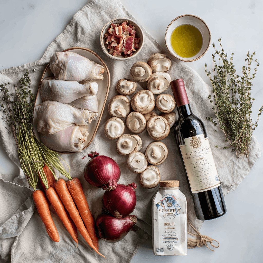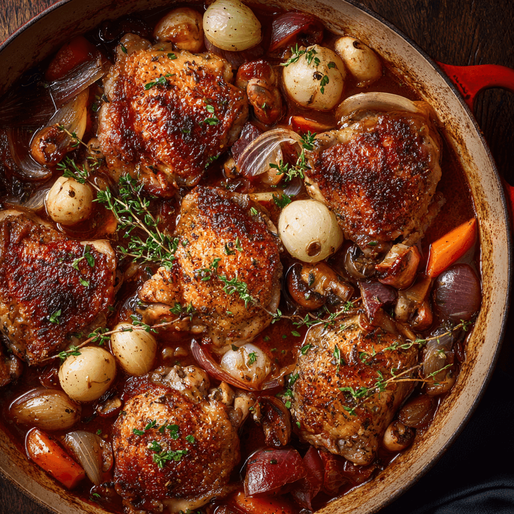 Sourced for soulful synergy, these in the French chicken casserole recipe favor Burgundy wine for authentic tang—fresh thyme elevates the finish.