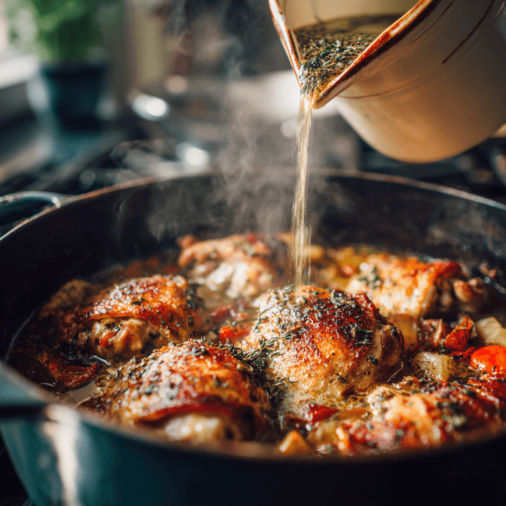 Sear chicken, sauté veggies/bacon, braise in wine/broth, finish with cream—French chicken casserole soaks authentically in 45 min.