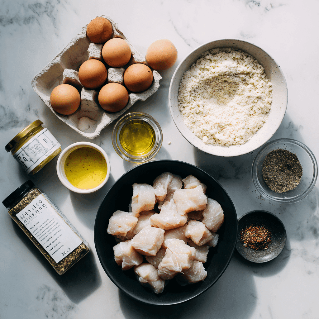 - 1 lb boneless skinless chicken breast, cut into 1-inch cubes: Lean protein star for keto chicken nugget.