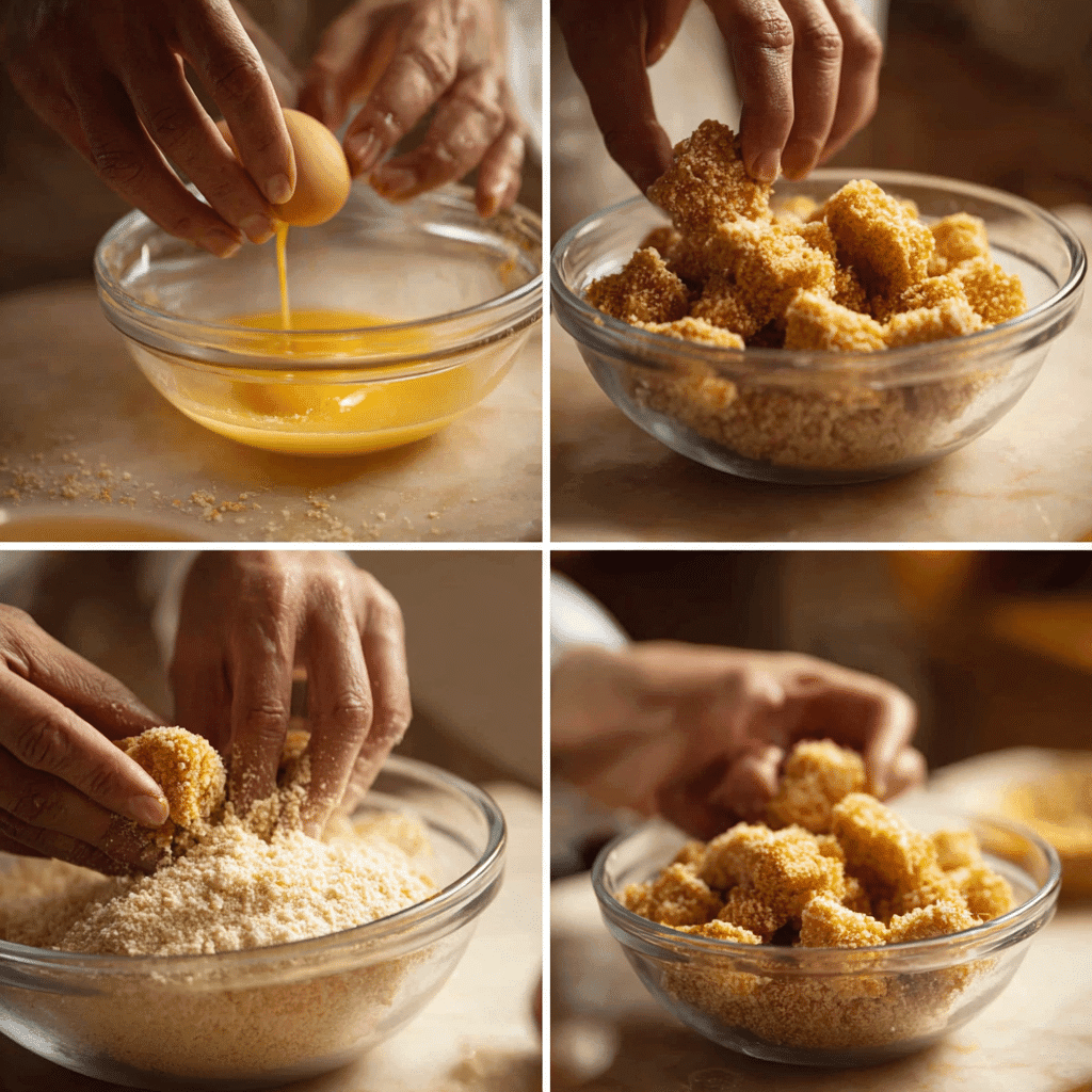 Working in batches, dip chicken pieces in egg, letting excess drip—then roll in dry mix, pressing to adhere fully. This double-action locks flavor and crunch on keto chicken nugget. Place coated keto chicken nugget on prepared sheet or plate—avoid overcrowding for even results.