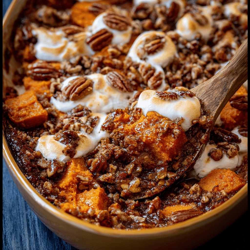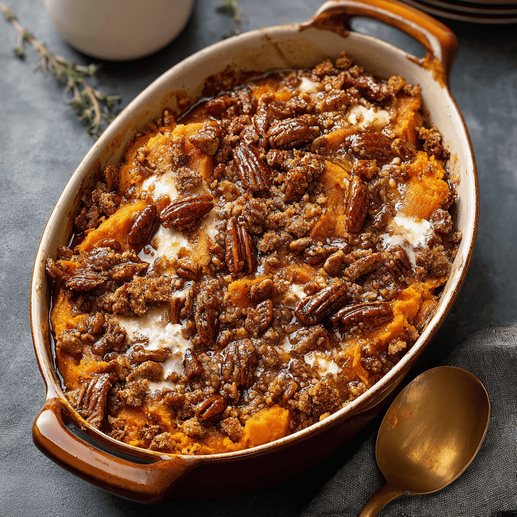 Boil/mash sweet potatoes with maple/butter/eggs/spices, top with pecan streusel (add marshmallows), bake golden—southern maple sweet potato casserole ladles luminous in dish.