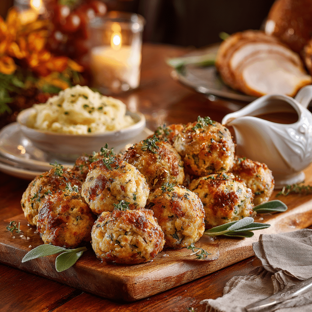 Turkey stuffing balls are baked herbed bread spheres with sausage and cranberries—festive bites for easy serving.