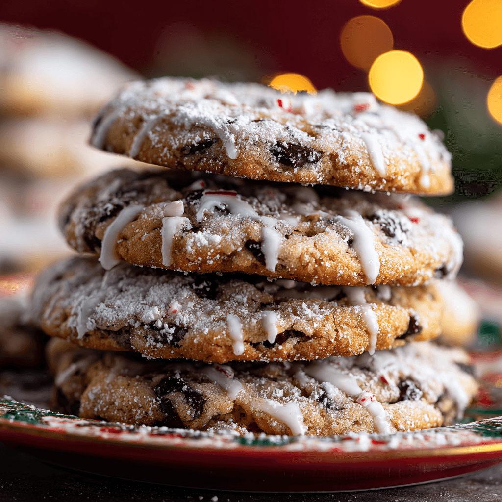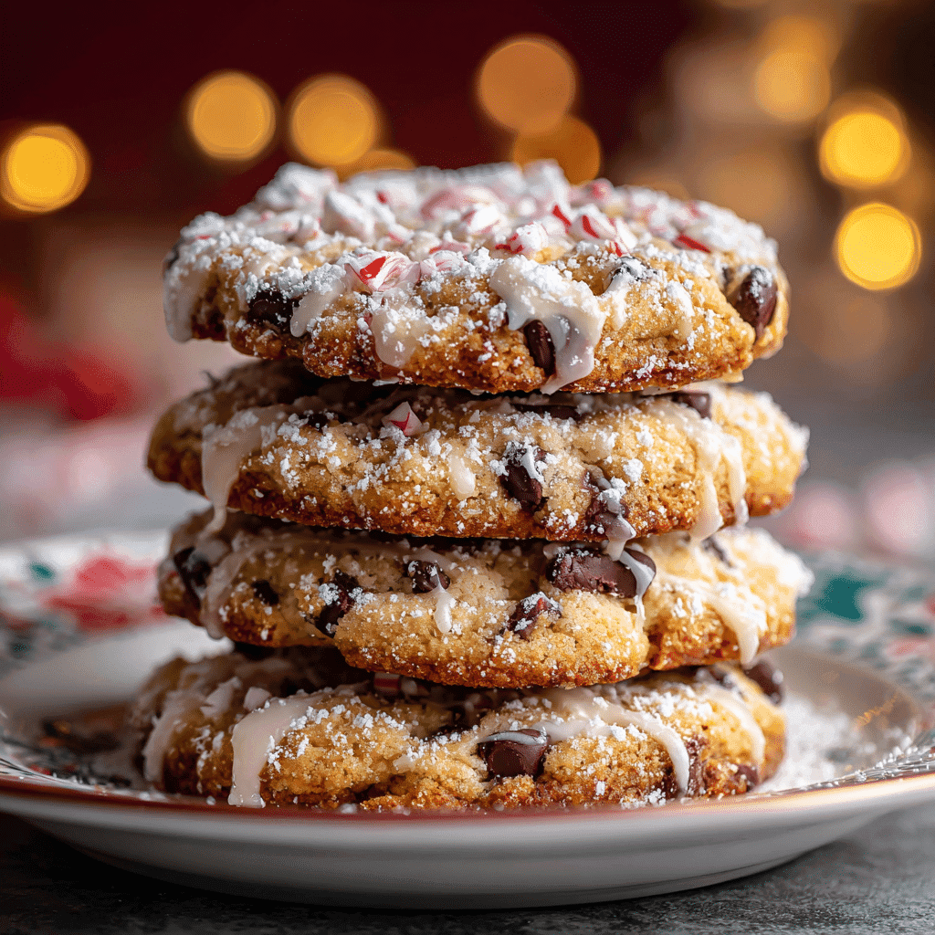 Whisk glaze ingredients until smooth; drizzle over cooled cookies—the cream firms gently. Scatter remaining peppermint and shavings—the freshness brightens winter wonderland chocolate chip cookies. Serve with cocoa—pairs with milk for balanced winter wonderland chocolate chip cookies.